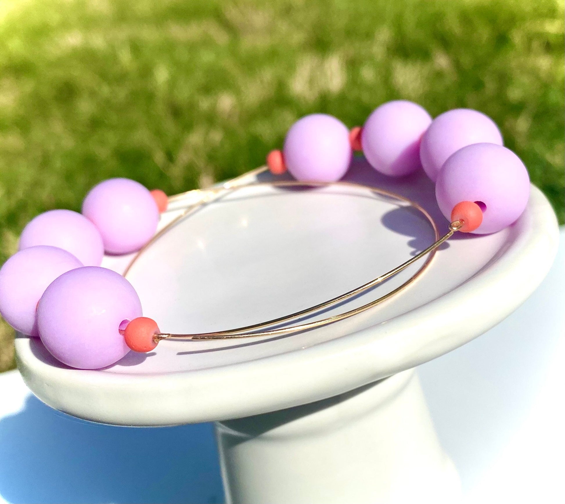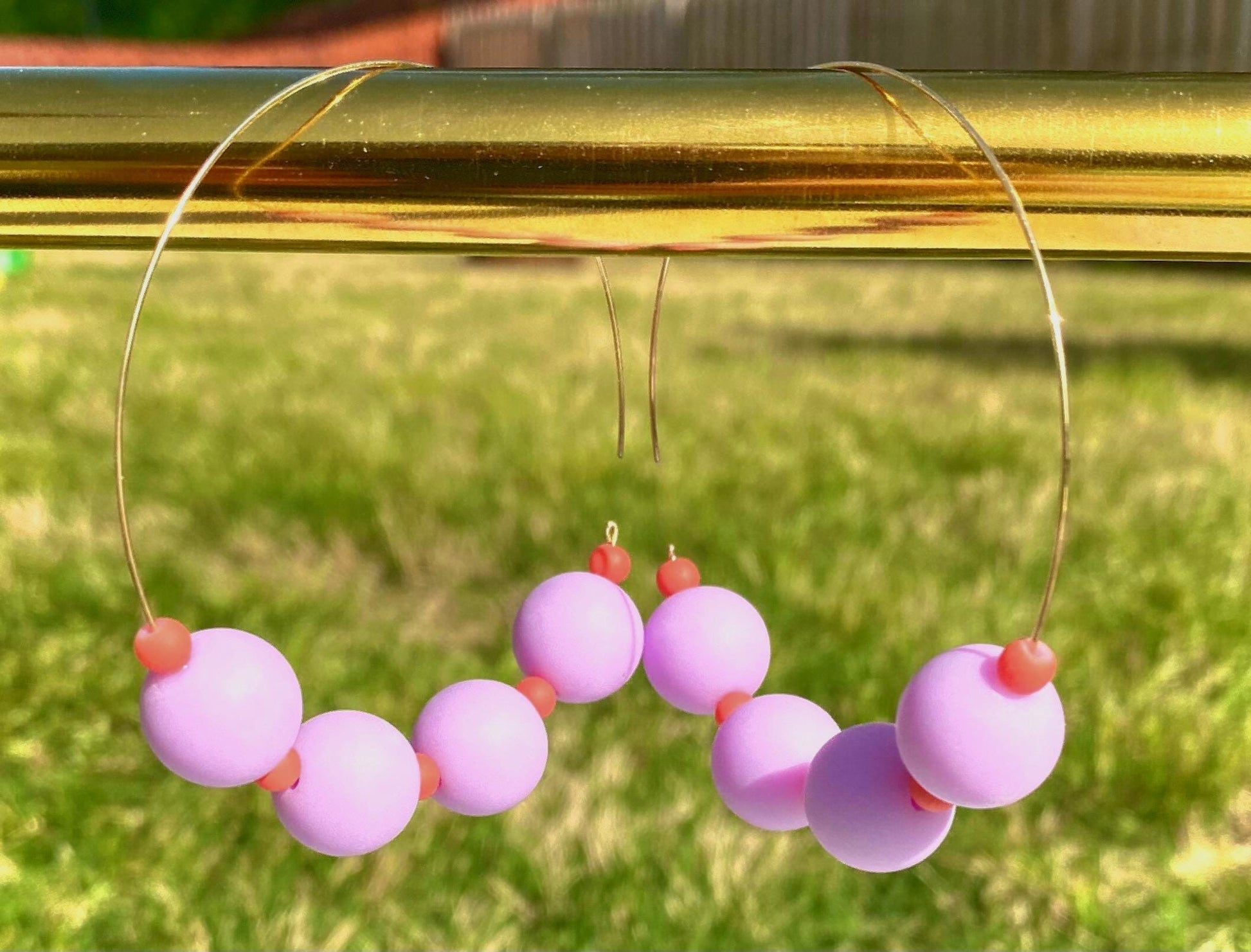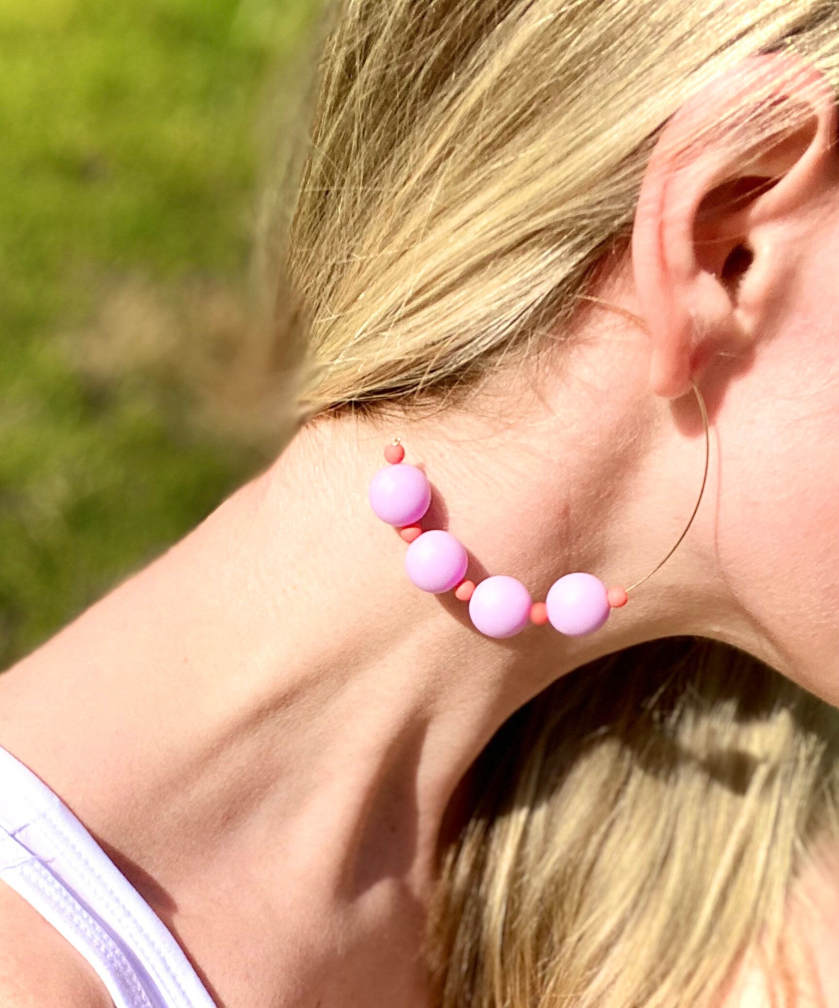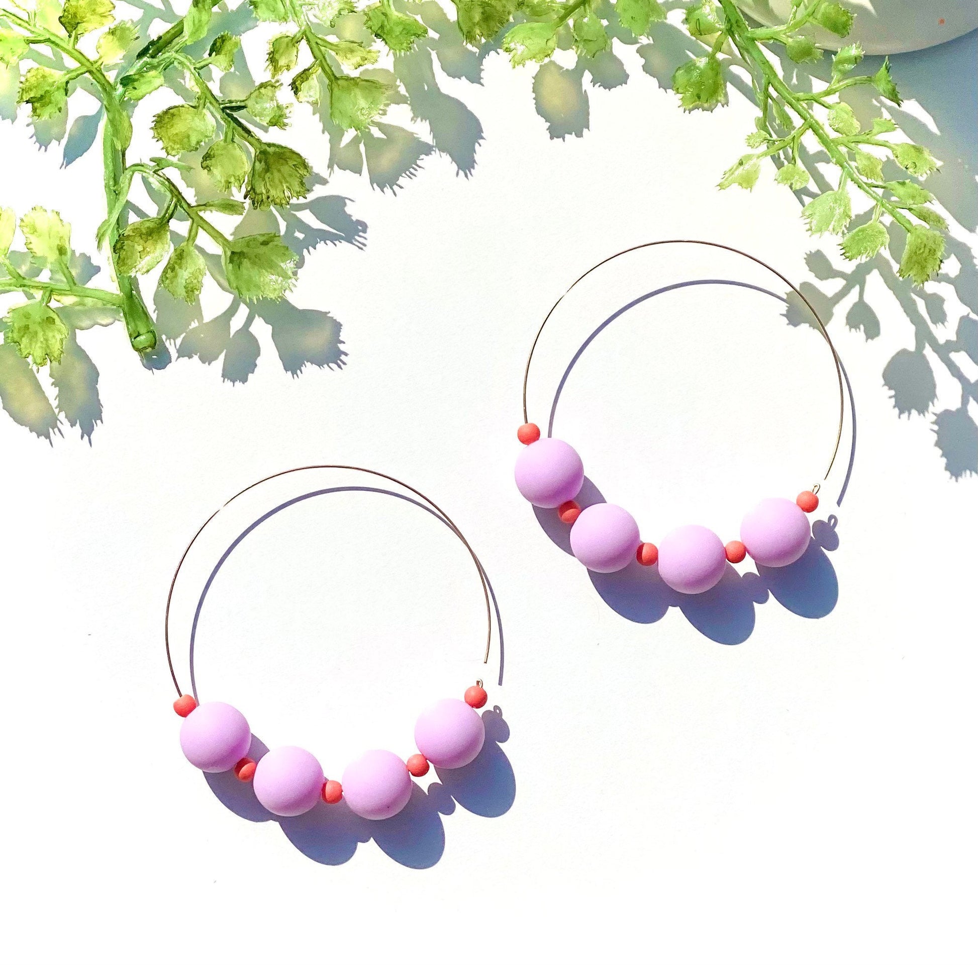Add a touch of playful elegance to your look with these charming handmade hoop earrings! Featuring a delicate gold-tone hoop adorned with smooth, matte lilac (or lavender) beads and subtle coral accent beads, these earrings are designed to effortlessly elevate any outfit.