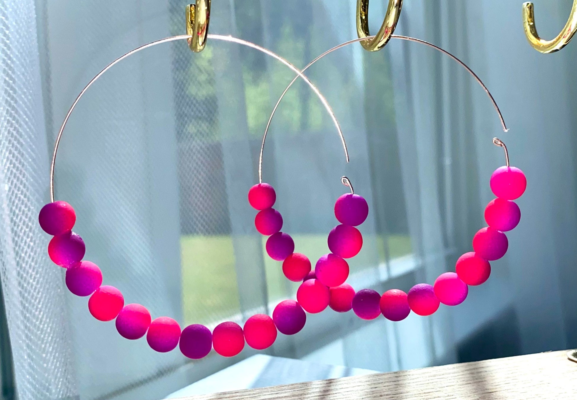 Handmade, hand crafted uniquely designed earrings. Large gold open hoop, light weight and comfortable everyday earrings. Brightly beaded hoops fading into pink and purple ombre. Perfect for summer time! Chunky colorful hoop earrings.