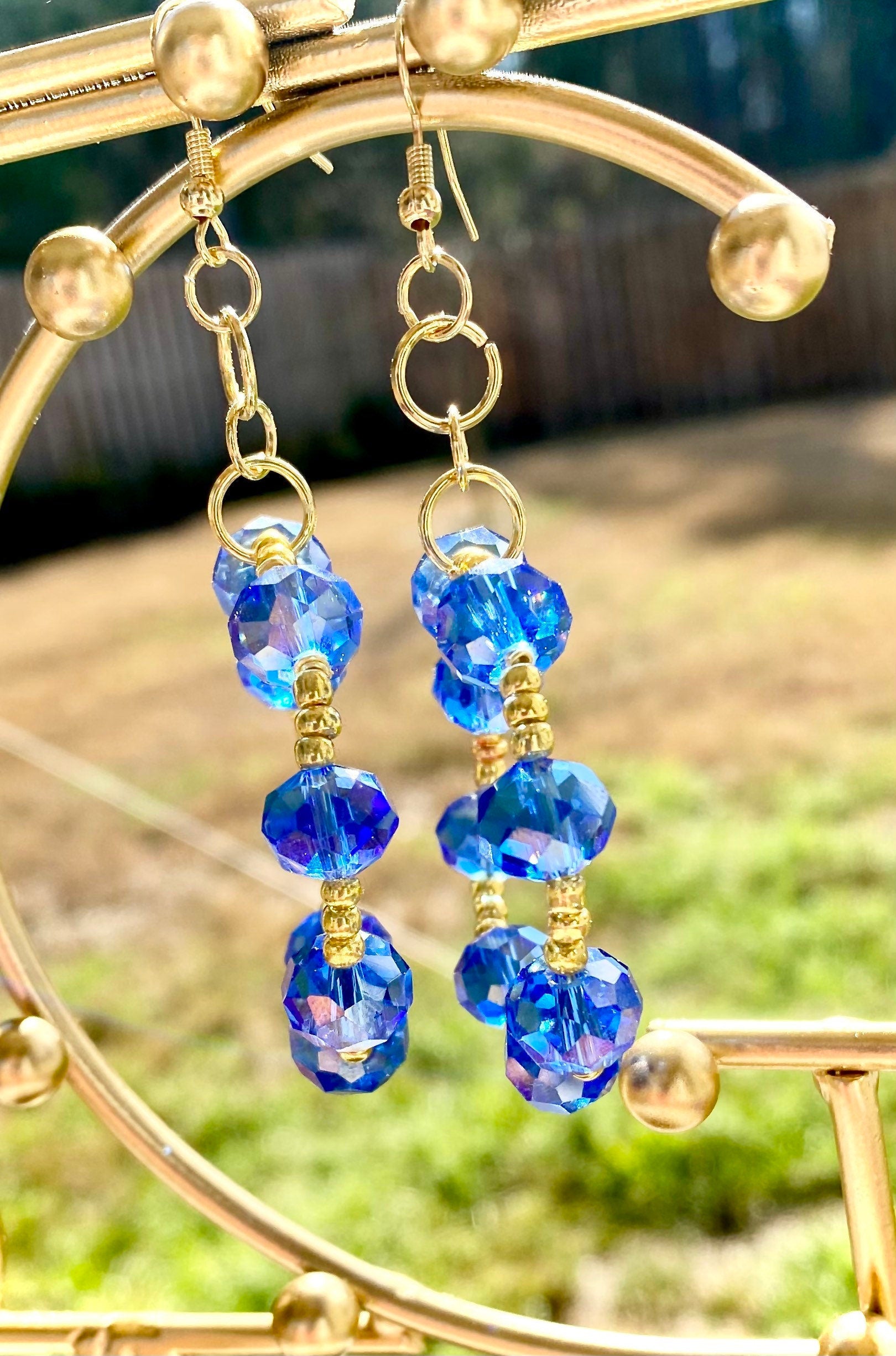 Sapphire blue crystal earrings | sparkly blue and gold chandbali style earrings | handmade gold plated wire wrapped chandelier earrings | prom earrings | pageant earrings | bridesmaid | wedding | gift | blue jewels | blue and gold | hoops | hoop earrings.