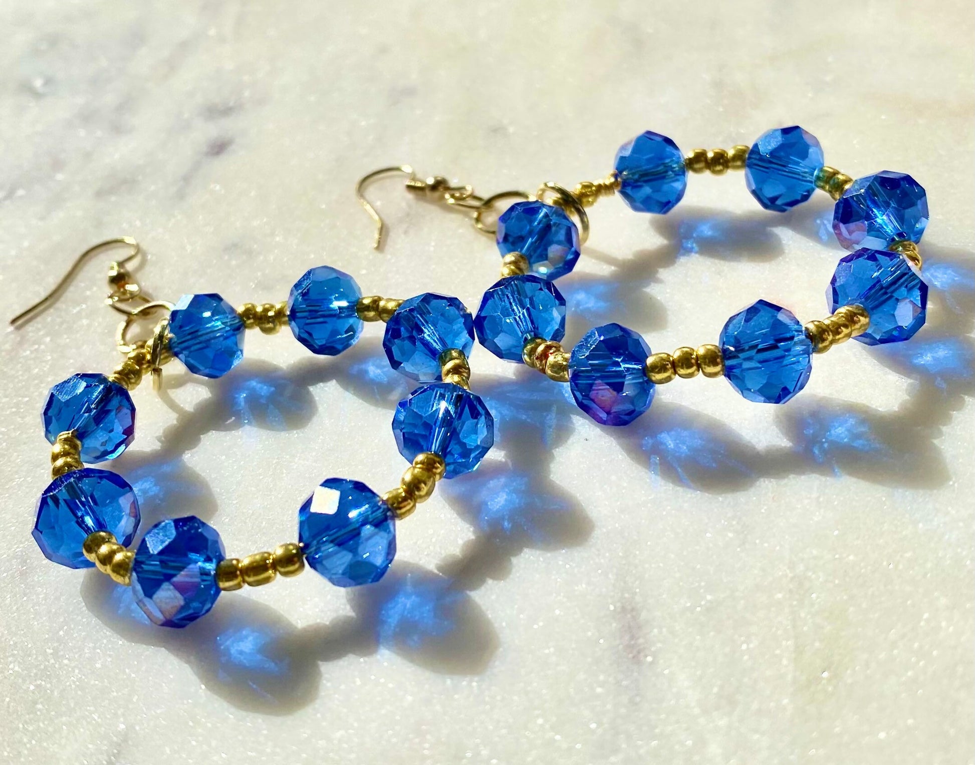 Sapphire blue crystal hoops | sparkly blue and gold chandbali style earrings | beaded gold hoops | dangle earrings | bright blue rhinestones
